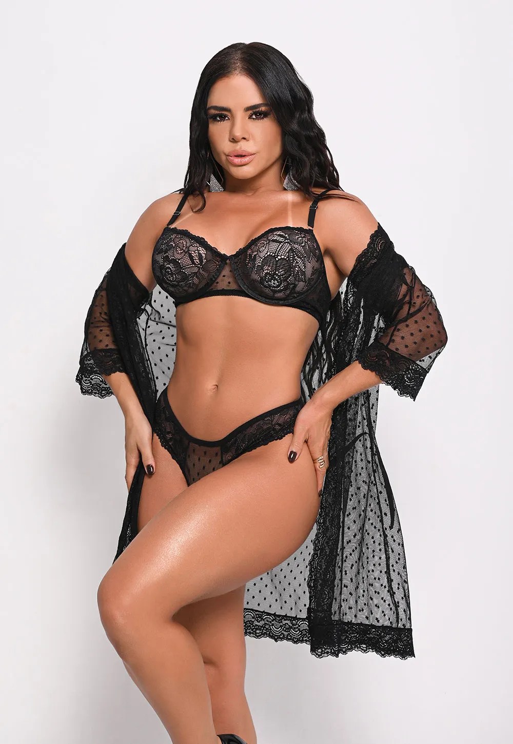 Conjunto de Renda com Sutiã Calcinha e Robe