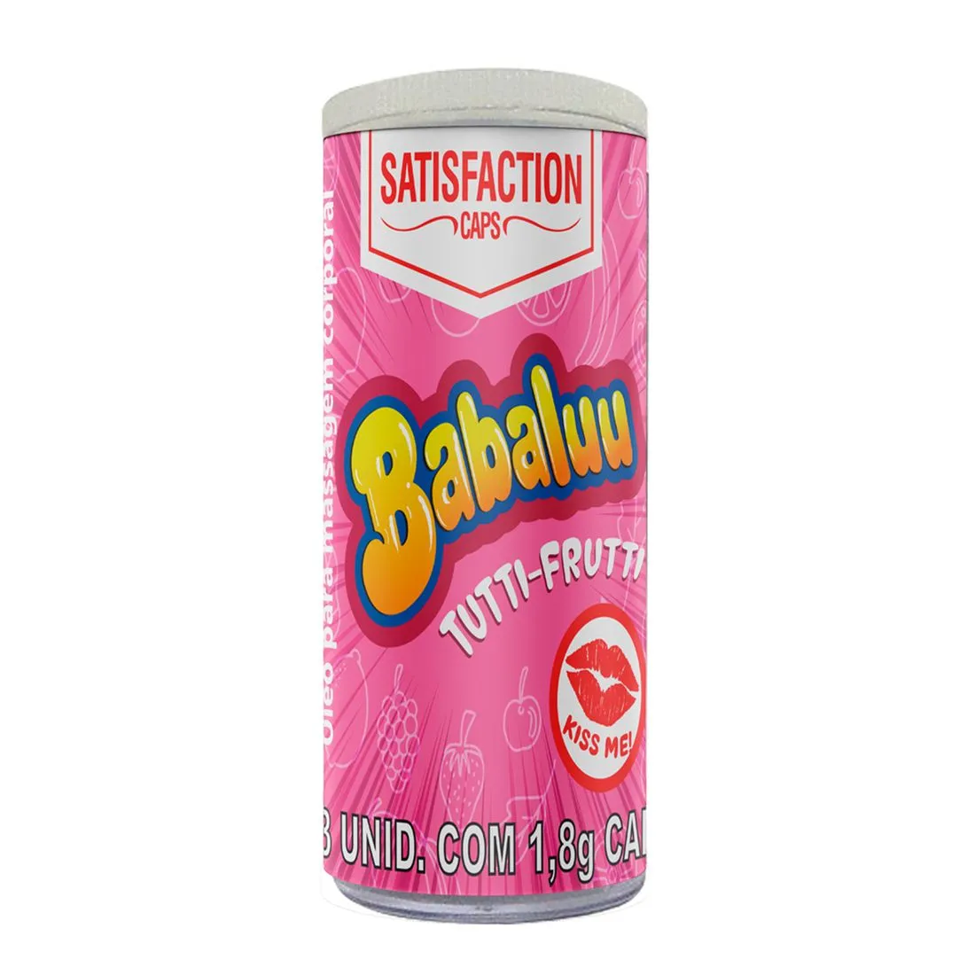 As Bolinhas Explosivas Babaluu da Satisfaction Caps possuem: Água, Gelatina, Glicerol, Metilparabeno, Propilparabeno, Corante de Ponceau 16255, óleo de soja, Neotame, Cera branca de abelha, Manteiga de Karité, Aroma.
