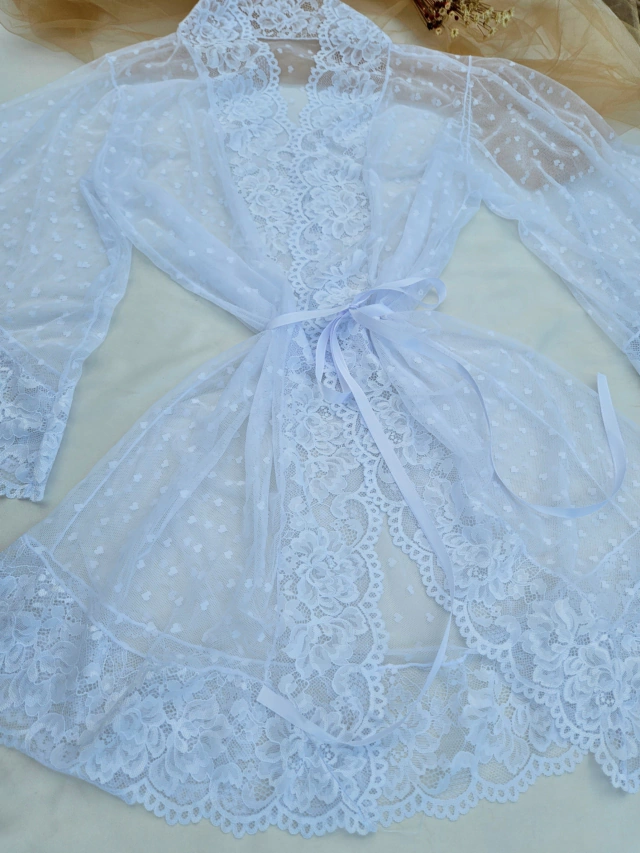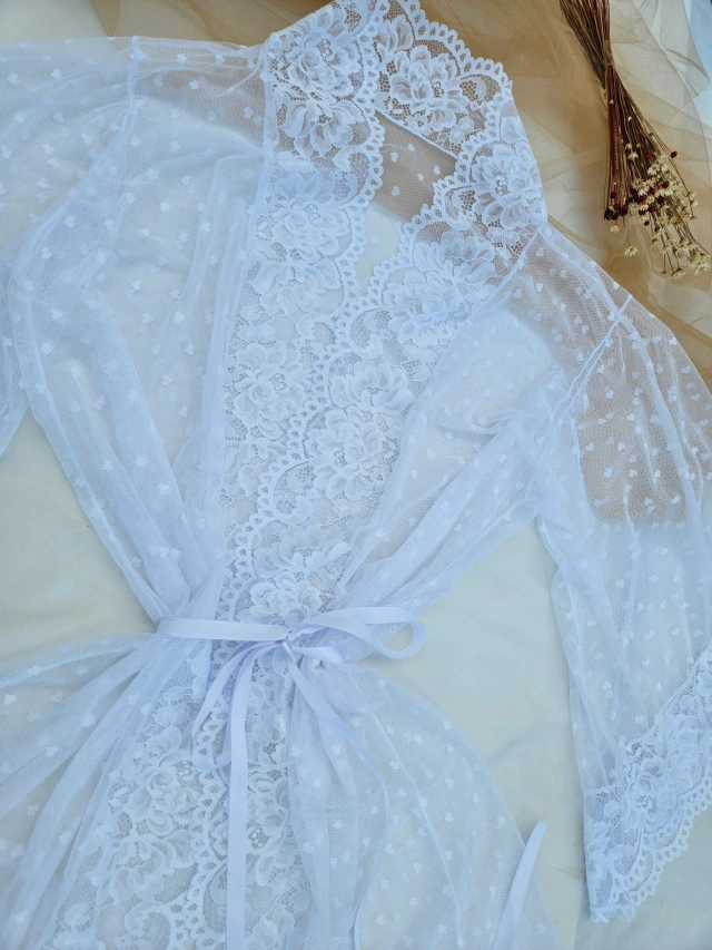 O Robe Branco de Tule com Manga Média é a escolha perfeita para quem deseja unir sofisticação e sensualidade com um toque de romantismo. Confeccionado em tule leve e transparente, ele oferece um caimento fluido e delicado, valorizando o corpo com suavidade e charme. Ideal para momentos especiais, esse robe é versátil, confortável e irresistivelmente elegante.