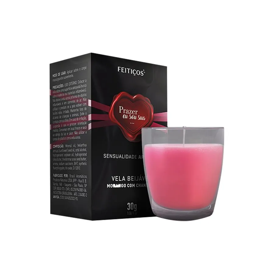 A Vela Beijável Linha Sensualidade Ardente de morango e chantilly conta com manteiga de cacau, que possui ação antioxidante e combate os radicais livres, permitindo a destruição das células que causam envelhecimento precoce da pele, manteiga de Karité que combate o ressecamento e aumenta a elasticidade e maciez cutânea e cera de soja, que é rica em Fitoestrógeno, um tipo de estrogênio vegetal que ajuda a rejuvenescer as células da pele.