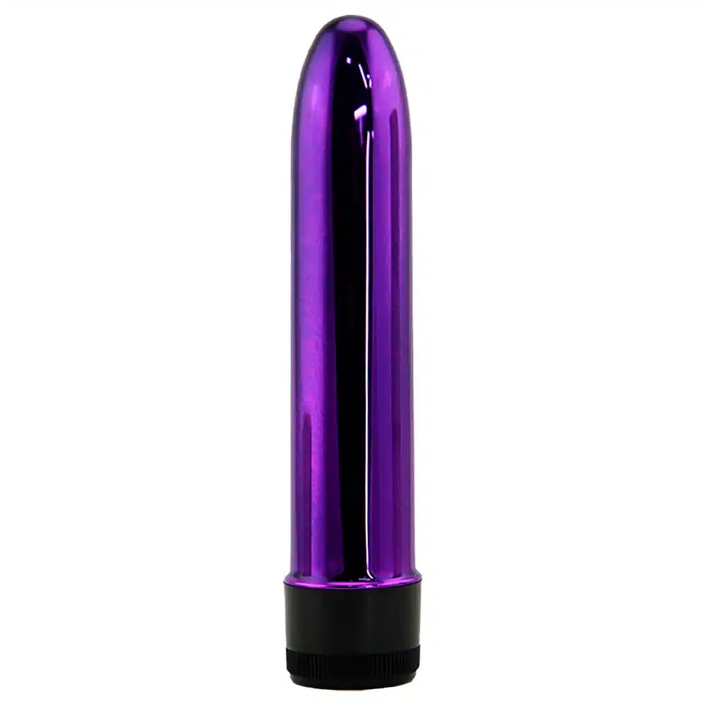 Vibrador Personal Cromado 17Cm Multivelocidade Roxo possui superfície lisa cromada e um motor multivelocidade controlado a partir de um botão giratório em sua base. Pode ser usado com capas penianas e como vibrador anal.